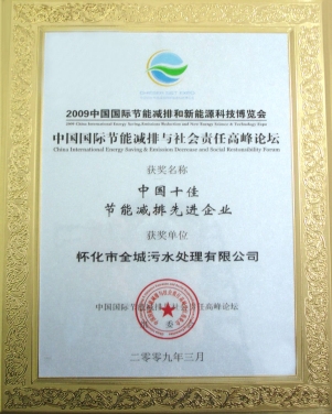 2009年3月在胡锦涛、温家宝等中央领导出席的中国国际节能减排与新能源科技博览会和高峰论坛上评为“中国十佳节能减排先进企业”。